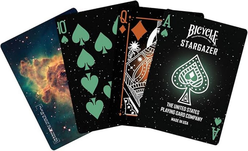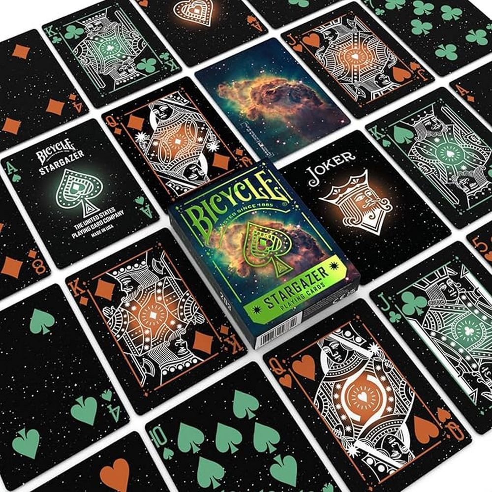 Pachetul de carti de joc Bicycle Stargazer 203 aduce in mainile tale miracolul astronomiei: designul de pe spate este inspirat de uimitoarea nebuloasa Carina, cu nuante vii de portocaliu si albastru. Liniile si motivele celeste, ce amintesc de zodiac si constelatii, creeaza o atmosfera magica la fiecare joc.