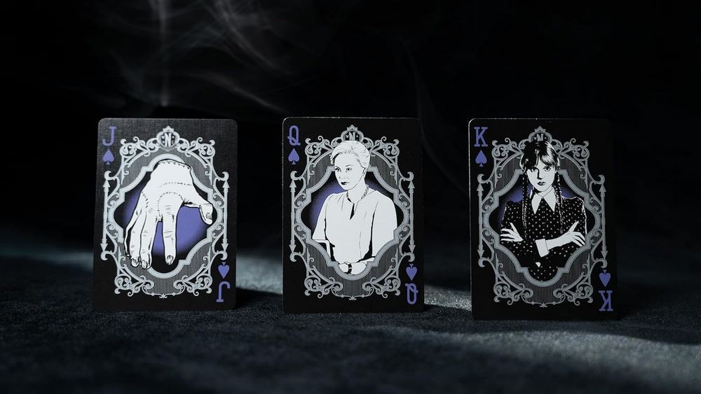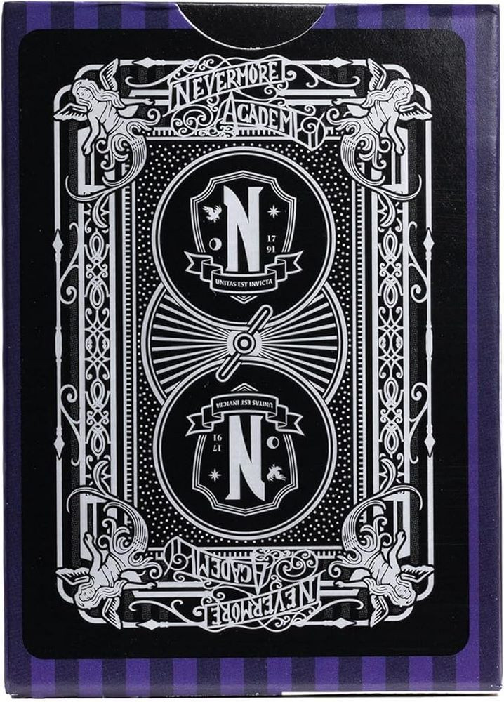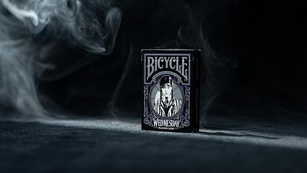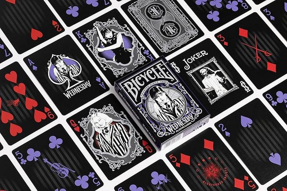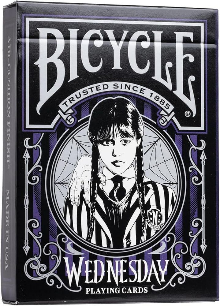 Bicycle Wednesday Addams – eleganta gotica si atmosfera iconica. Descopera lumea intunecata a academiei Nevermore cu pachetul de carti de joc Bicycle Wednesday Addams! Aceasta editie speciala aduce atmosfera serialului Netflix Wednesday: carti de culoare negru intens, ilustratii detaliate si motive gotice care transforma fiecare amestec intr-o experienta unica.