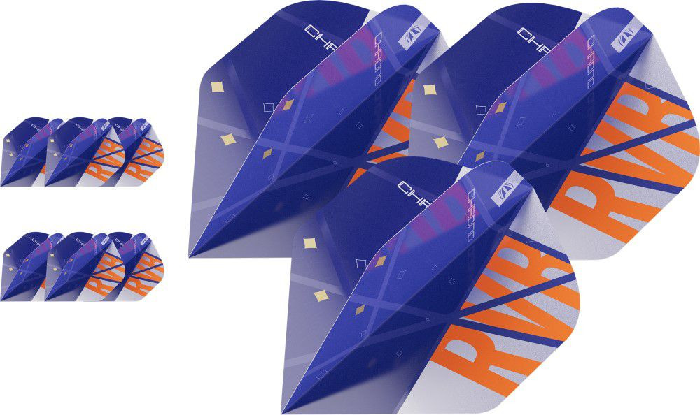 Proiectat pentru seria de darts Raymond van Barneveld Chrono, cu un design atragator in nuante de portocaliu, albastru si gri. Fluturasii sunt imprimati spot UV, oferind un strat suplimentar pentru a imbunatati prinderea tijei si a proteja designul impotriva uzurii.
