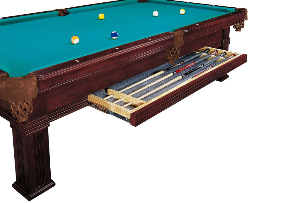 Designul elegant ii confera un aspect deosebit de rafinat. Masa este construita cu panouri robuste din lemn masiv, iar picioarele si partile laterale sunt fabricate din lemn masiv. Ardezia naturala de inalta calitate, din trei parti, garniturile de cauciuc profesionale si postavul de calitate club asigura o rulare precisa a bilelor si o revenire exacta a acestora. Sertarul incorporat este deosebit de practic, oferind un loc sigur pentru depozitarea tacurilor valoroase si a altor echipamente.