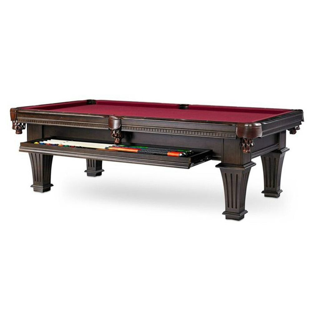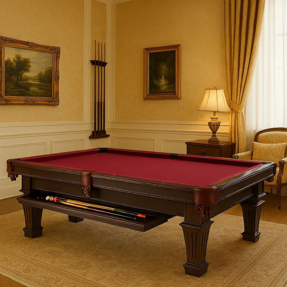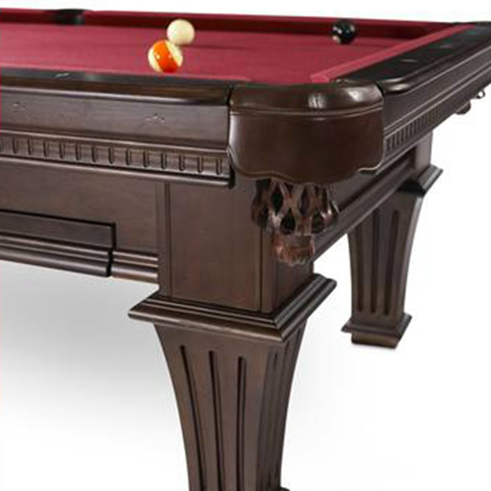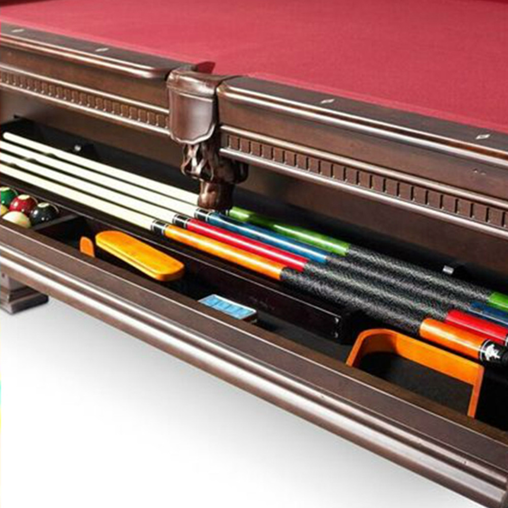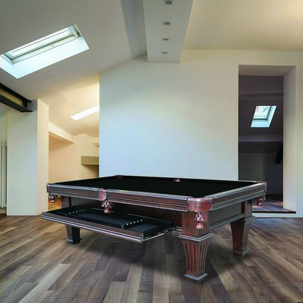 Masa de biliard eleganta cu sertare. Picioare din lemn masiv. Buzunarele din piele se contopesc perfect in culoarea mesei. Insertiile in forma de diamant in partea superioara a mesei, ajuta jucatorii pentru determinarea unghiului de lovire. Masa din lemn masiv, cu mante k66, iar placa de ardezie este din trei bucati.