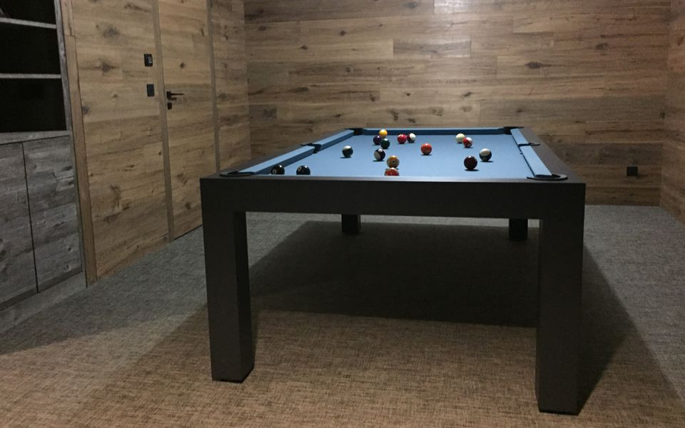 Masa de biliard Pearl este o masa care poate fi transformata intr-o masa de sufragerie, iar o husa de poker poate fi comandata si in culoarea dorita. A fost creata pe baza unor considerente estetice, incat se potriveste perfect in orice sufragerie sau sala de jocuri. Cadrul sau subtire si picioarele inguste o fac o masa perfecta de luat masa sau de jocuri, dar cadrul metalic incorporat o face o masa de biliard puternica si solida. Aspectul mesei Pearl poate fi variat, masa prezentata in poza este modelul de baza, dar va putem pune la dispozitie si blat de poker la cerere, iar culoarea si materialul blatului mesei pot fi si ele variate contra cost. Daca aveti alte cerinte, va rugam sa ne contactati si va vom trimite o oferta speciala. Suprafata de joc: 200 * 100cm Greutate: 320Kg Accesorii: 4 tacuri, set de bile, perie, triunghi, suport tac de perete Pretul nu include scaunele prezentate in poze. Puteti alege culoarea postarii. timp de productie: 3 luni