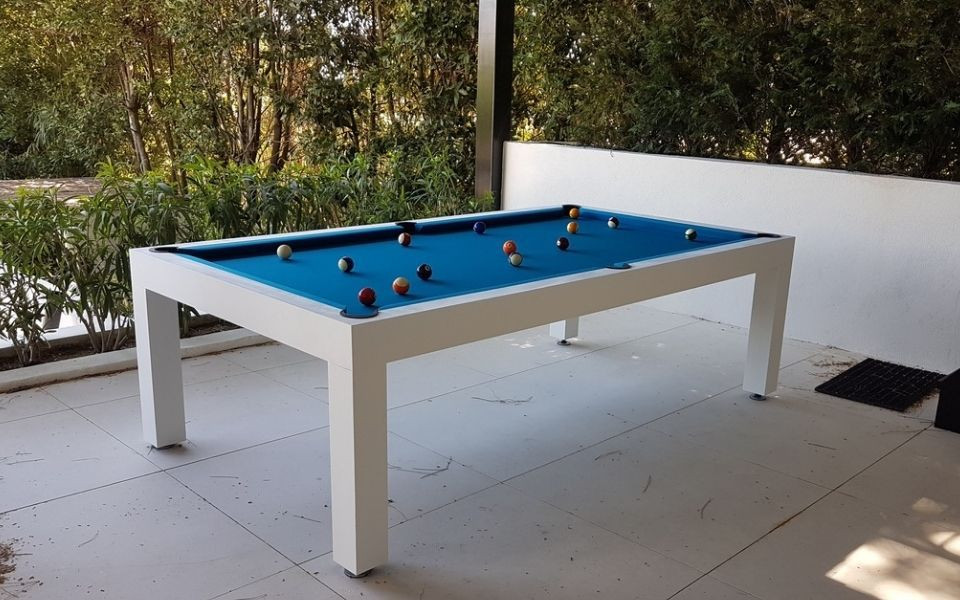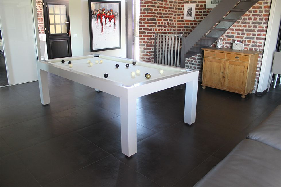 Masa de biliard Pearl este o masa care poate fi transformata intr-o masa de sufragerie, iar o husa de poker poate fi comandata si in culoarea dorita. A fost creata pe baza unor considerente estetice, incat se potriveste perfect in orice sufragerie sau sala de jocuri. Cadrul sau subtire si picioarele inguste o fac o masa perfecta de luat masa sau de jocuri, dar cadrul metalic incorporat o face o masa de biliard puternica si solida. Aspectul mesei Pearl poate fi variat, masa prezentata in poza este modelul de baza, dar va putem pune la dispozitie si blat de poker la cerere, iar culoarea si materialul blatului mesei pot fi si ele variate contra cost. Daca aveti alte cerinte, va rugam sa ne contactati si va vom trimite o oferta speciala. Suprafata de joc: 200 * 100cm Greutate: 320Kg Accesorii: 4 tacuri, set de bile, perie, triunghi, suport tac de perete Pretul nu include scaunele prezentate in poze. Puteti alege culoarea postarii. timp de productie: 3 luni