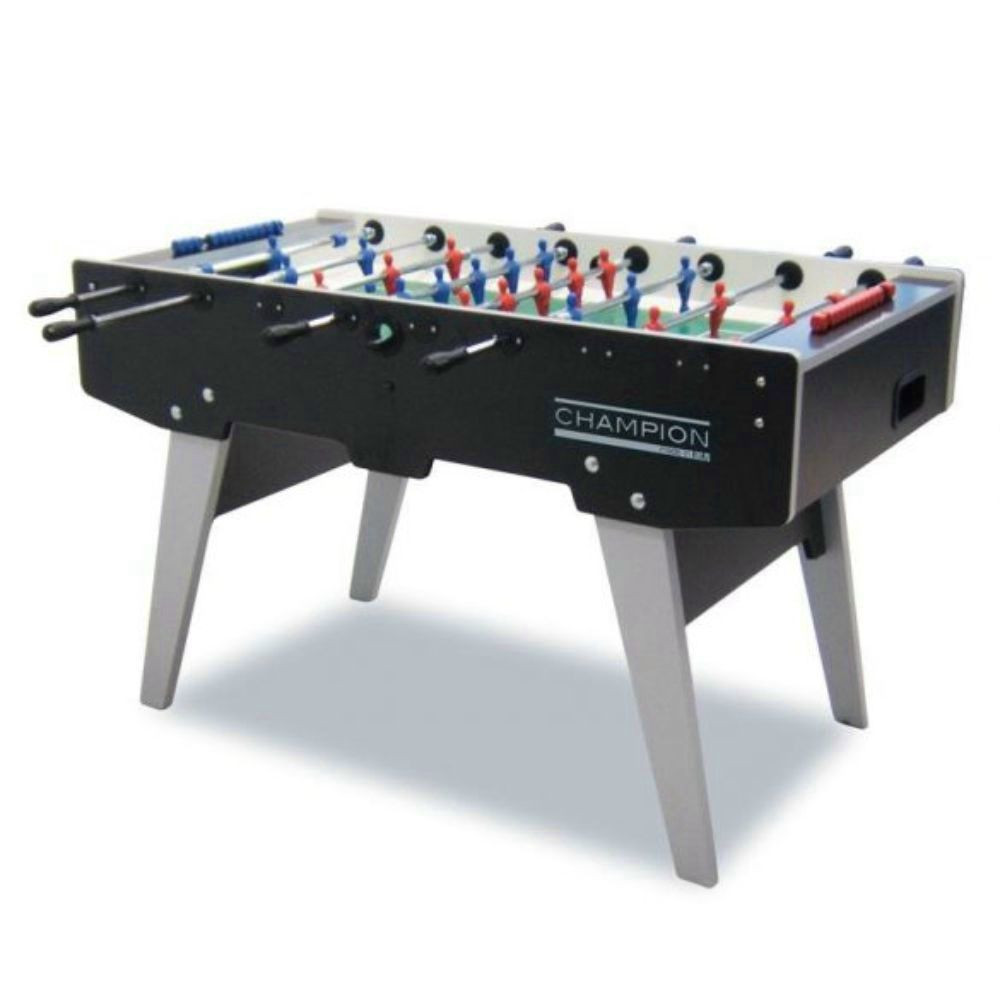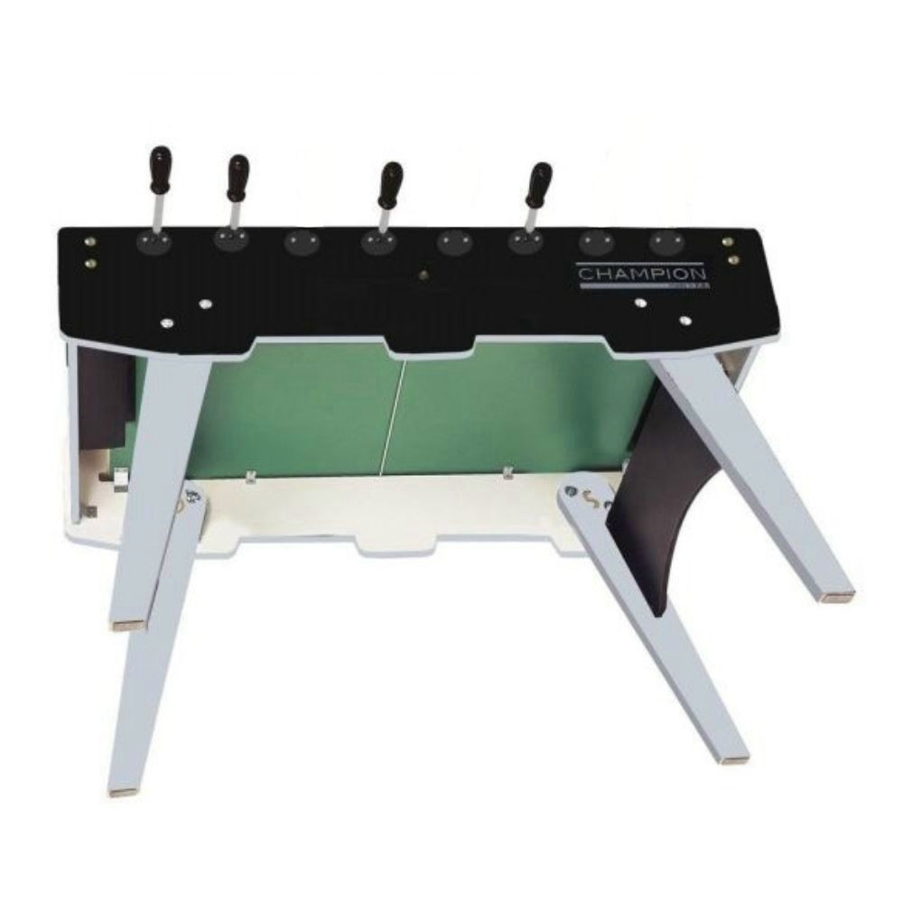 Masa de fotbal Garlando Champion cu tije telescopice, picioare rabatabile, cu portar care nu se roteste peste cap - Culoare: negru - Tija telescopica – Suprafata de joc din sticla sablata cu nisip - Rulment cu bile - Corp masa din tabla MDF cu grosime de 20 mm Picioare rabatabile pentru o depozitare mai usoara. Produsul contine 10 mingi. Proiectat cu portar care nu se roteste peste cap, cu tija din otel cu diametrul de 16 mm. Cutie pentru mingi, care se afla in spatele ambilor portari. Echipat cu un contor de scor. Respecta standardele de siguranta UE. - Dimensiuni: 152x80x33 cm - Lungime: 144 cm - Latime: 76 cm - Latime totala cu tijele trase 125 cm - Greutate: 70 kg - Conditii de plata si livrare: Mesele sunt livrate intr-o cutie, dezasamblate. Asamblarea nu necesita nicio cunostinta de specialitate, poate fi montat cu usurinta cu ajutorul desenului de asamblare.