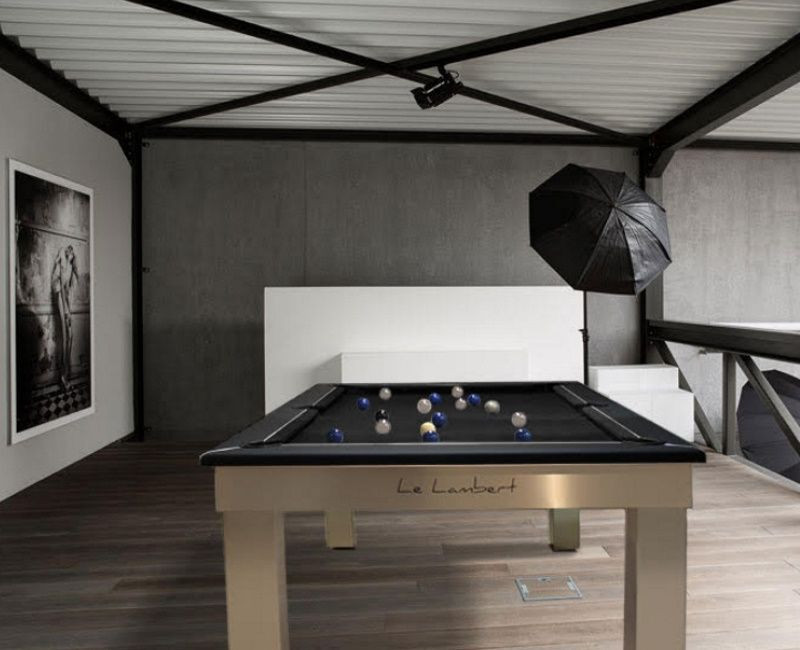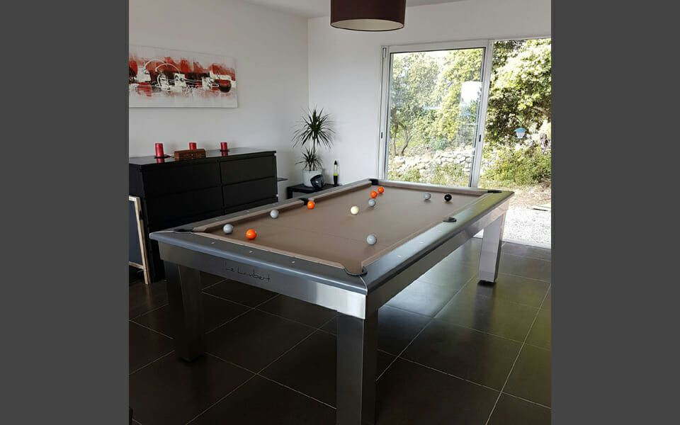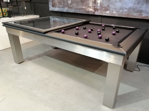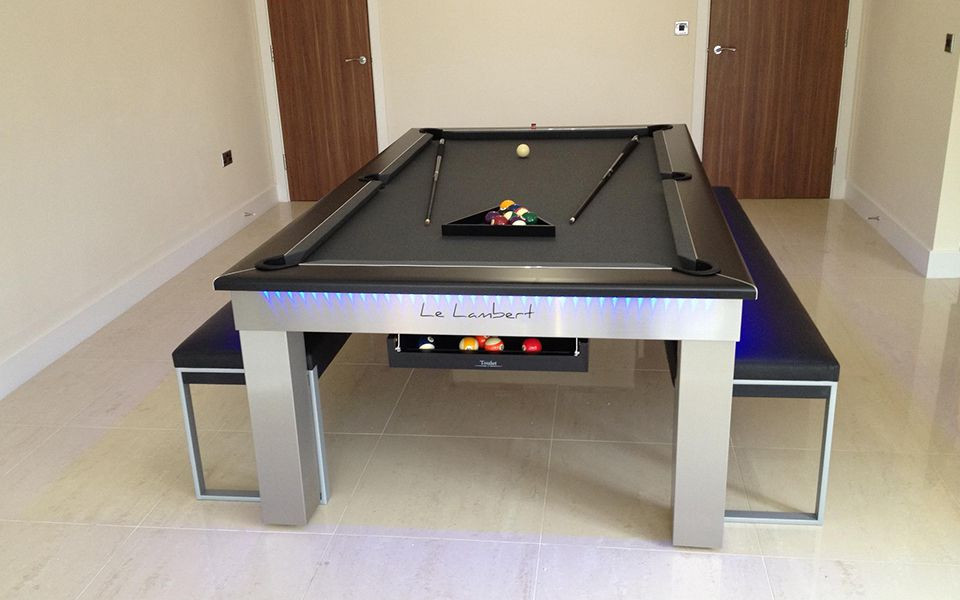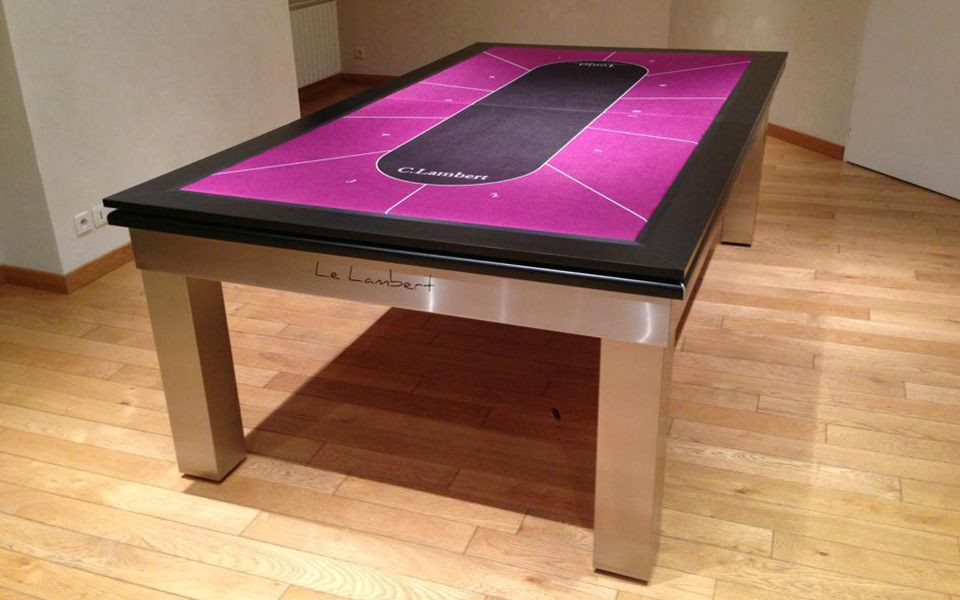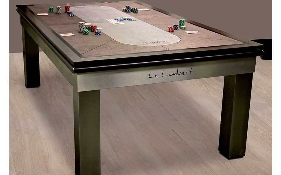 Masa de biliard Lambert este o masa care poate fi transformata intr-o masa de sufragerie, iar o husa de poker poate fi comandata si in culoarea dorita. Masa Lambert a fost creata pe baza unor considerente estetice, incat se potriveste perfect in orice sufragerie sau sala de jocuri. Cadrul sau subtire si picioarele inguste o fac o masa perfecta de luat masa sau de jocuri, dar cadrul metalic incorporat o face o masa de biliard puternica si solida. Aspectul mesei Lambert poate fi variat, masa prezentata in poza este modelul de baza, dar va putem pune la dispozitie si blat de poker la cerere, iar culoarea si materialul blatului mesei pot fi si ele variate contra cost. Poate fi din sticla, metal sau chiar ping-pong. Daca aveti alte cerinte, va rugam sa ne contactati si va vom trimite o oferta speciala. Mandinele in forma de L, sistem silentios de intoarcere a mingii disponibil la cerere. Picioare si corp din metal periat. Picioare reglabile. Suprafata de joc: 220 * 120cm Greutate: 400Kg Accesorii: 4 tacuri, set de bile, perie, triunghi, suport tac de perete Pretul nu include scaunele prezentate in poze. Puteti alege culoarea postarii. timp de productie: 3 luni
