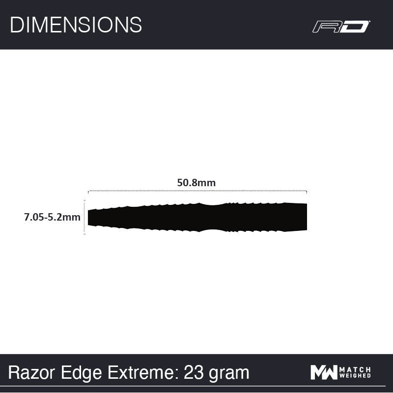 Sageti darts RedDragon steel Razor Edge Extreme, 23g, 90% tungsten Razor Edge Extreme este cel mai recenta sageata de ultima generatie cu maner Razoredge agresiv, conceput pentru sport. Perfect modelat. Grosime corp: 7,05 mm Lungime corp: 50,8 mm Greutate corp 23 grame Continut tungsten 90% Categorie: Profesionist Set: 3 buc. set de sageti cu varfuri metalice fixe pentru borduri traditionale - din hartie presata sau canepa sisal.La acest set nu se ofera extra reducere. Nici revanzatorilor, nici pentru jucatori.