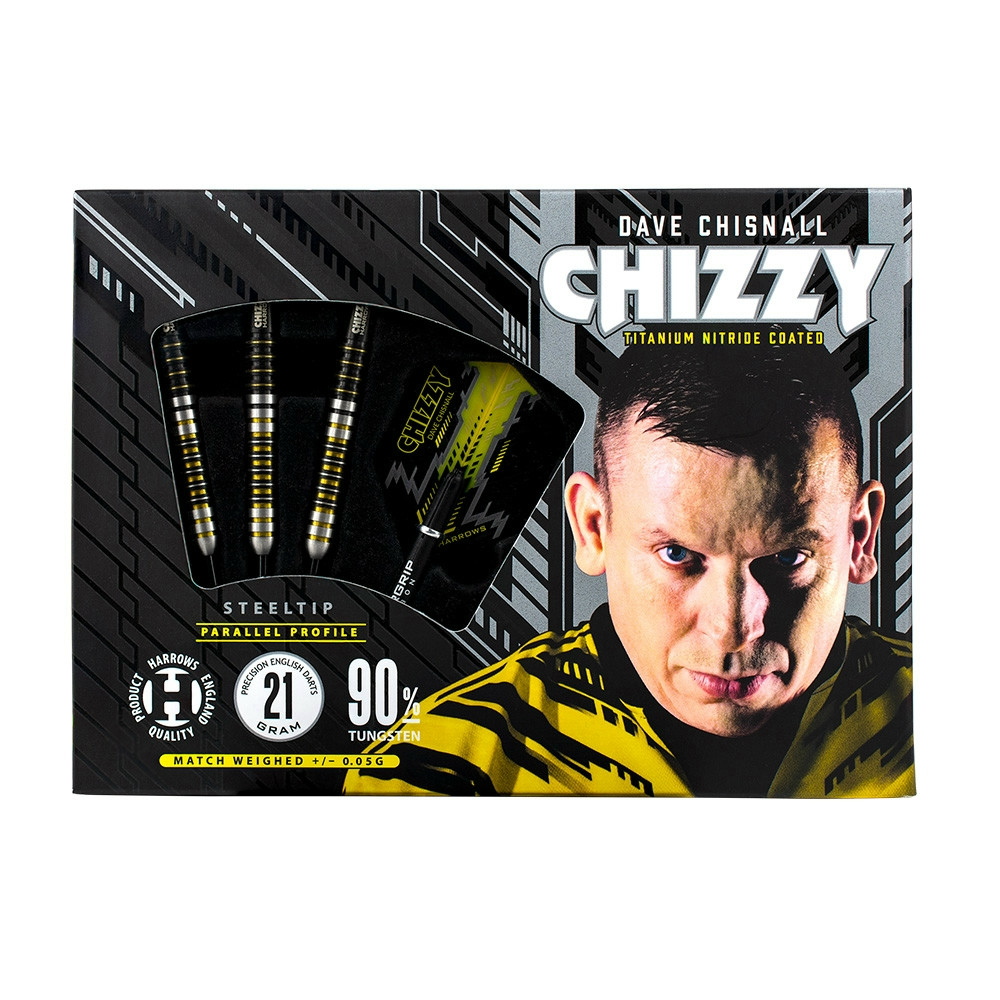 Set darts Harrows steel 21g, Chizzy 90% wolfram Cu ajutorul lui Dave Chisnall si al echipei Harrows, s-a nascut cel mai recent set, prelucrat complet pentru a se potrivi nevoilor sale. - Corpul are un continut de 90% wolfram si este completat cu freze patrate. Chizzy a avut nevoie de o aderenta mai puternica, astfel ca au fost adaugate noua micro-gravuri suplimentare la set, precum si o acoperire de nitrit de titan care sa asigure o protectie suplimentara si un design galben-negru care a caracterizat profilul jucatorului. - Grosime corp: 6,30 mm - Lungime corp: 51,00 mm - Greutate corp: 21 grame - Continut de wolfram: 90% - Categorie: Profesional - Culoare: Aur-Argintiu-Negru - Tija: Supergrip Carbon, argint lung - Fluturas: Harrows Prime Chizzy negru - Varf: negru neted, lungime normala - Pachetul con?ine 3 sageti.
