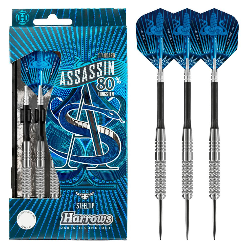 Set darts Harrows steel, 25g, Assassin, 80% wolfram Unul dintre cele mai populare sageti wolfram din lume. Exista multe stiluri si greutati, astfel incat combinate, aproape oricine poate gasi modelul potrivit. - Grosime corp: 7,20 mm - Lungime corp: 46,00 mm - Greutate corp: 25 grame - Continut de wolfram: 80% - Categorie: Avansat - Culoare: Argintiu - Tija: Alamo lungime 48 mm (ES203LBK) - Fluturas: Hologram 1606, 75 micron - Varf: Lungimea standard, neagru, neted - Pachetul include 3 sageti darts si o carcasa simpla din plastic.