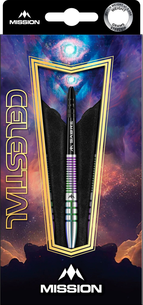 Experimenteaza o experienta divina de darts cu setul de darts Mission Celestial! Fabricat din tungsten de inalta calitate, 95%, cu acoperire PVD corali, pentru a oferi jucatorilor un set de darts de top. Pe partea din spate a corpului se afla caneluri orizontale, care se subtiaza natural catre o zona centrala neteda, cu logo-ul Mission gravat cu laser. Sectiunea cu caneluri mai late duce catre un nas care se termina intr-un varf negru. Dartsul Celestial vine cu o tija neagra Mission Sabre, care fixeaza strans fluturasi. Fluturasul Mission Celestial are un design impresionant, inspirat din spatiu.