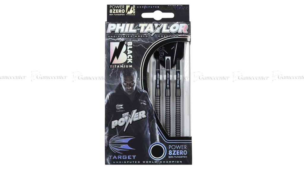 Sageti Darts TARGET soft POWER 8ZERO BLACK 1 Va prezentam necontestatul Campion Mondial Phil "The Power" Taylor, cu 16 titluri Campion Mondiali si alte 76 de titluri majore.Power 8Zero Black este acoperit cu un strat ultradens de 80% tungsten negru si nitrura de titan inainte de a fi prelucrat complet pentru a oferi o prindere unica. Pe acest set se gaseste gravat cu laser sigla Power 8ZERO. lungime corp 6,25 mm lungime corp 53,85mm buc 1 echipat Greutatea: 19 grame Volfrám tartalma 80% Categoria: avansat culoare:negru Tije: Pro Gripp scurte 34 mm plastic negru (trg 110170) fluturasi: Power 8zero Vision 100 micron (trg 200670) Varf: Plastic negru de calitate superioara, Filet standard 2BA Sageti 3 bucati.Pachetul contine si o husa simpla cu efect de piele.