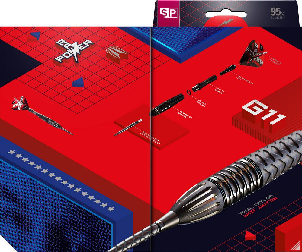 Setul de darts Power 9Five Generation 11 Phil Taylor Raw Power, creat in colaborare cu campionul mondial de 16 ori, este proiectat pentru a indeplini exact specificatiile si cerintele sale de joc din ultimul sau sezon competitiv. Fabricat cu un corp din 95% tungsten de inalta densitate, acest set ofera o prindere unica, prelucrata cu precizie. Corpul cu forma cilindrica este tratat prin sablare si acoperit cu un strat PVD negru pentru a-i imbunatati durabilitatea si aspectul estetic.