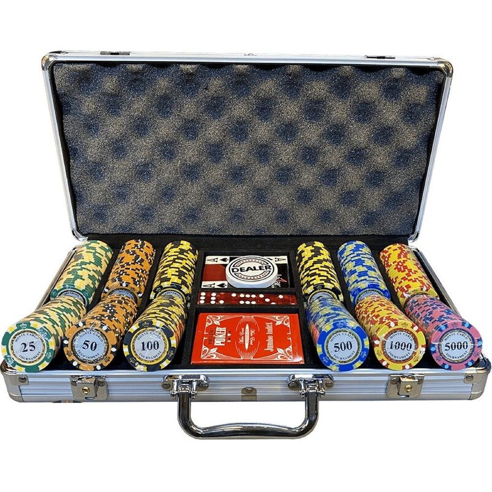 Set poker, 300 buc Monte Carlo, 14g, cu numere mari, cu doua pachete de carti 100% plastic  Accesorii: 2 pachete de carti plastic.- Dealer premium. 5 zaruri rosii de poker- O valiza de aluminiu pentru 300 jetoane. Greutatea setului: aprox. . 5,4 kg.