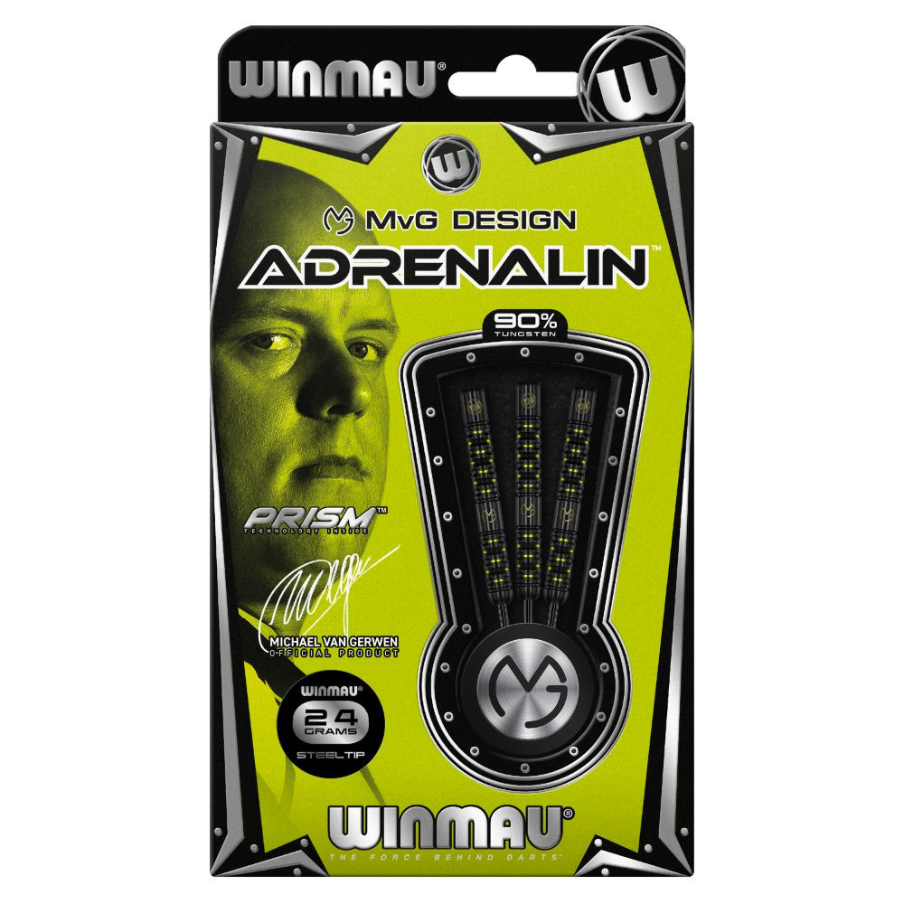 Set sageti Winmau steel MvG Adrenalin 24g, 90% wolfram. Aceste noi seturi fabricate de Winmau sub numele fantezist Adrenalin cu ajutorul lui Michael van Gerwen au 24 Grame. Grosimea corpului: 6,20 mm Lungimea corpului: 54,6 mm Greutatea Corpului: 24 Grame Continut wolfram: 90% Categoria: Profi Culoare: negru, verde Tije: Vecta negru, 41 mm lungi (7025.201) Fluturasi: Prism Alpha standard, 100 micron (6915.143) Varf: Standard negru . Setul contine 3 sageti. Setul contine un protector metallic MvG Pentru borduri din carton presat, sau canepa sisal.