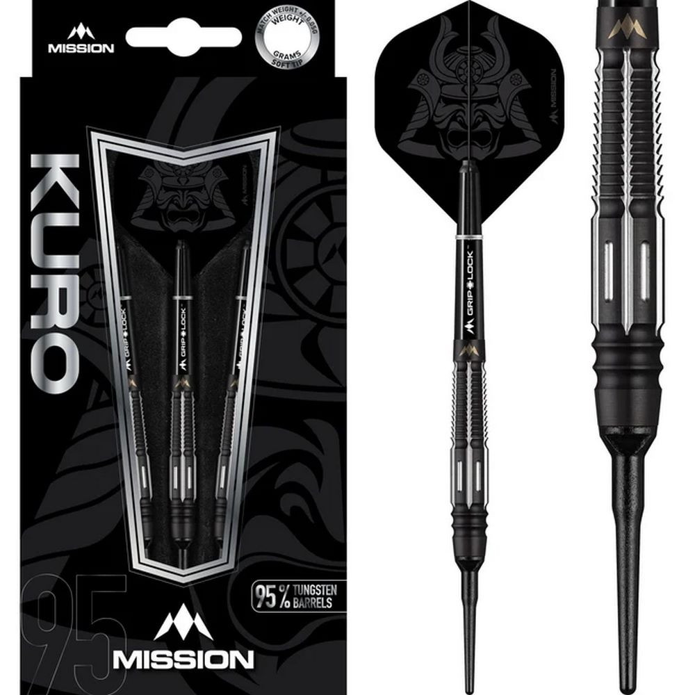 Mission Kuro Soft Tip este un darts cu corp in forma de torpila, care se ingusteaza spre spate. Acoperirea PVD cu titan-nitrid negru ofera un aspect elegant, in timp ce corpul prezinta pe toata lungimea alternanta intre striatii fine tip „dinti de rechin” si striatii paralele precise, care asigura o priza si un control excelente. Corpul este gravat cu laser cu logo-ul Mission, subliniind calitatea premium. Acest model este o alegere ideala pentru cei care cauta un darts soft tip stilat, precis si durabil.