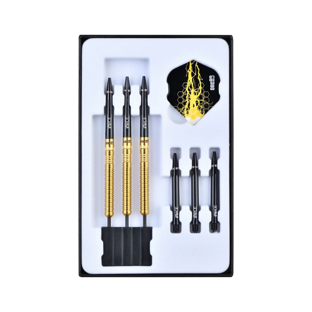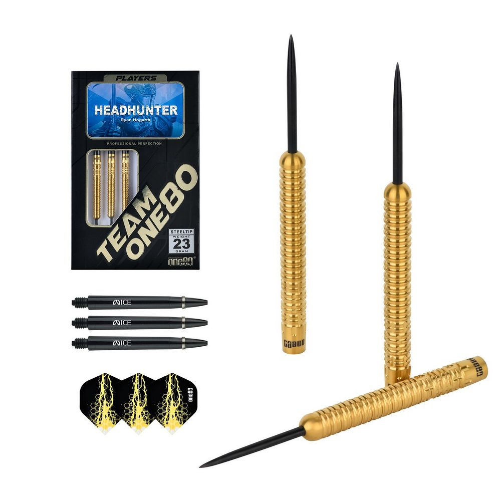 Set sageti darts steel One80 Ryan Hogarth Signature Dart 23g, 90% wolfram Set creat manual, 90% Marja de eroare permisa +/- 0,1 grame Grosimea corpului: 6,3 mm Lungimea corpului: 52,5 mm. Continut wolfram: 90% Categoria: Profi Culoare: auriu Tije: Lung 48 mm, plastic Fluturasi: Standard, One80, 100 microni Varf: Standard, negru Pachetul contine 3 sageti.