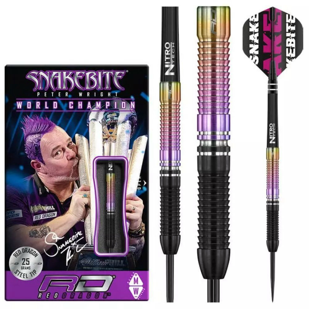 Set sageti darts RedDragon steel Peter Wright World Champion 25g, 90% wolfram Grosimea corpului: 6,4 mmLungimea corpului: 54,6 mmGreutatea corpului: 25gContinut wolfram: 90% Categoria: premiumCuloare: negru, curcubeu Tija: Nitro Tech lung, negru Fluturas: