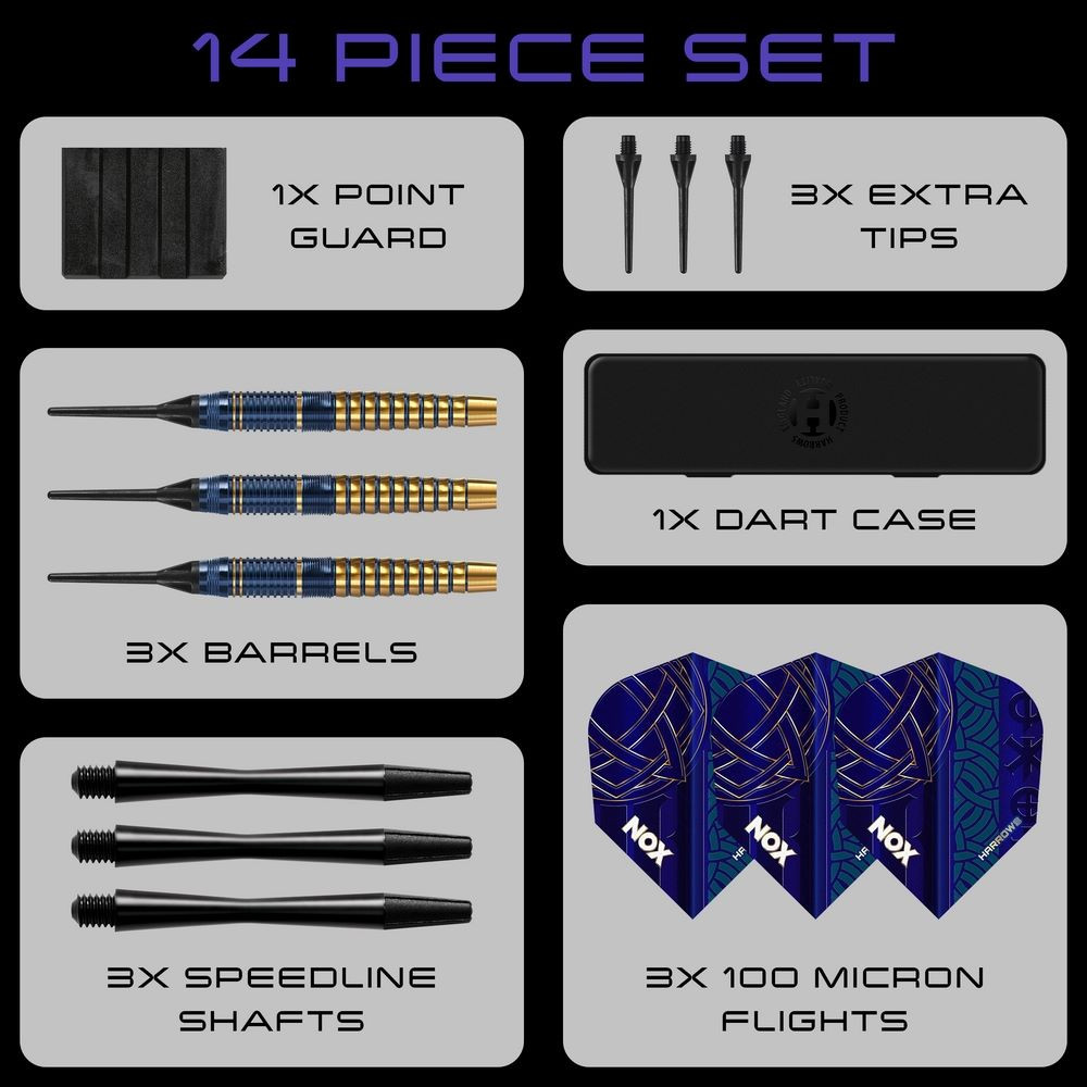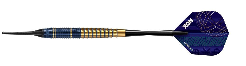 Harrows Nox este un set de sageti darts din alama, elegant si echilibrat, care combina perfect aderenta, controlul si designul rafinat. Corpul paralel este prelucrat cu precizie de-a lungul intregii lungimi, oferind o prindere sigura si stabilitate maxima la fiecare aruncare. Finisajul in doua tonuri – albastru regal si auriu – confera un aspect premium si distinctiv.