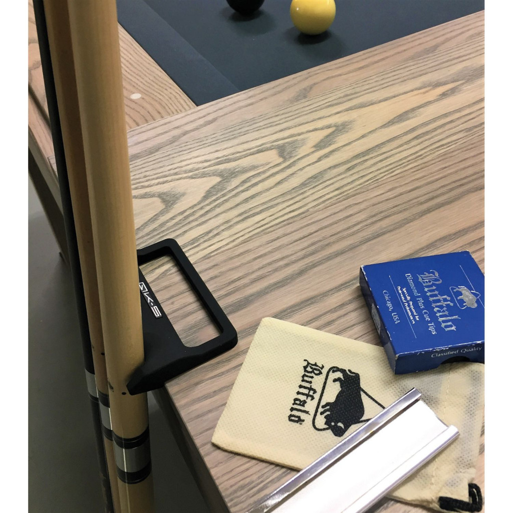Acest suport portabil Buffalo este alegerea ideala pentru orice jucator de biliard care doreste sa isi depoziteze tacurile in siguranta si ordine, fie acasa, fie la competitii. Cadrul metalic solid si acoperirea din cauciuc PVC rezistent la socuri asigura o durata lunga de viata, iar clipsul practic permite fixarea usoara de o masa, un raft sau o masa de biliard.