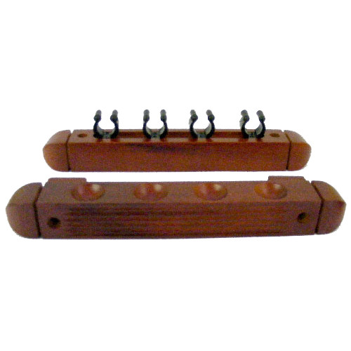Suport de perete pentru 4 tacuri, de culoarea lemnului de mahon. Fundul tacului se aseaza in partea inferioara, iar varful tacului se aseaza printre bucati de cauciuc montate in partea superioara.