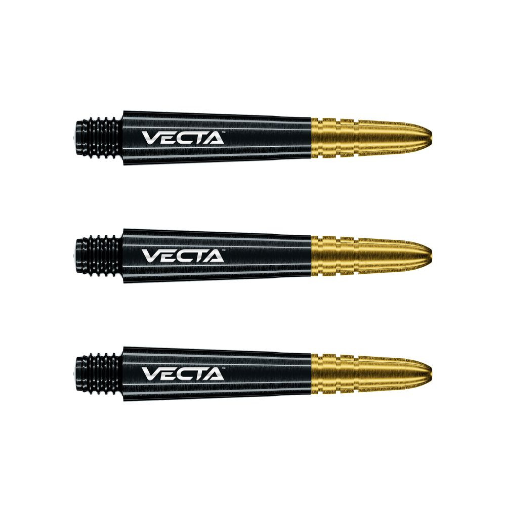 Tija darts Winmau Vecta, negru plastic, auriu cu top metalic, scurt 35mm Tija din policarbonat rezistent, cu top din aluminiu. Profilat si prelucrat cu fante extra adanci pentru un zbor mai bun. Testat de jucatori profesionisti Winmau.   Culoarea: negru-auriu Lungime: 35mm Material: plastic, cu top metalic Producator: Winmau Pachetul contine 3 tije.
