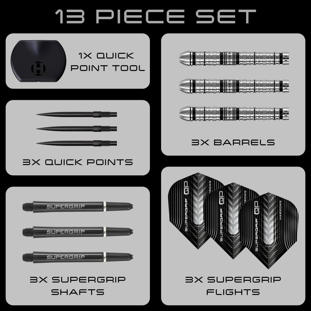 Harrows Supergrip QP Tapered este o reinterpretare moderna a celebrei serii Harrows Supergrip. Fabricat din 90% tungsten, acest set profesional de sageti darts ofera control deplin, echilibru perfect si performanta constanta. Textura adanc frezata, formata din inele simple si duble, asigura o aderenta excelenta si o eliberare lina si precisa a sagetii pentru o experienta de joc superioara.