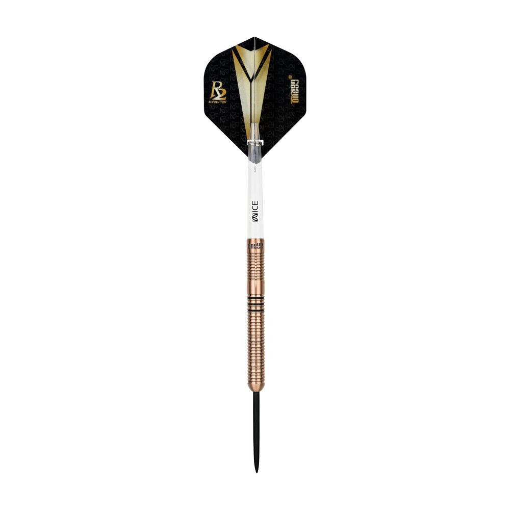 Set sageti darts steel One80 R2 Interchange Re-vamp 24g, 90% wolfram  Set creat manual, 90% Marja de eroare permisa +/- 0,1 grame Grosimea corpului: 6,35 mm Lungimea corpului: 54 mm. Continut wolfram: 90% Categoria: Profi Culoare: auriu Tije: Lung 48 mm, plastic, alb, Vice Fluturasi: Standard, One80, 100 microni Varf: Reflex, negru  Pachetul contine 3 sageti.