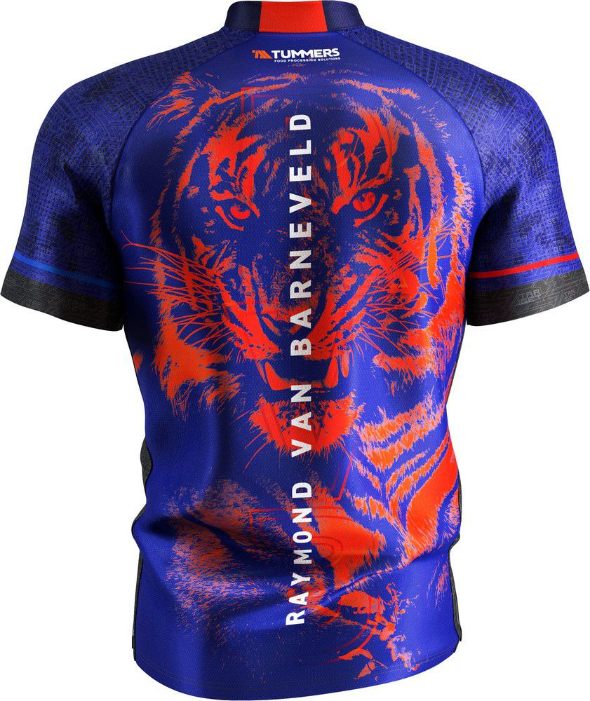 Tricoul oficial Raymond van Barneveld pentru 2025 este un echipament premium de darts, proiectat in colaborare cu de cinci ori campionul mondial. Fabricat dintr-un material de microfibra de inalta performanta, tricoul fara guler dispune de un sistem avansat de ventilatie care indeparteaza transpiratia de pe piele spre suprafata materialului, unde aceasta se evapora rapid, pastrandu-te uscat si confortabil in timpul meciurilor intense. Designul include cinci stele indraznete de culoare portocalie, pe un fundal mov cu dungi de tigru, simbolizand cele cinci victorii mondiale ale lui Raymond van Barneveld. Pe partea din spate, o grafica cu un tigru portocaliu, avand ochi rosii patrunzatori, face referire la melodia iconica de intrare a lui „Barney”, „Eye of the Tiger”